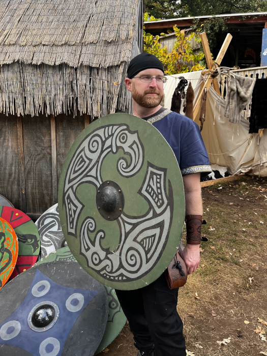 My new shield, with the guy who painted it (I also got a hammer and a sword).