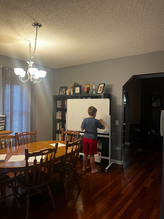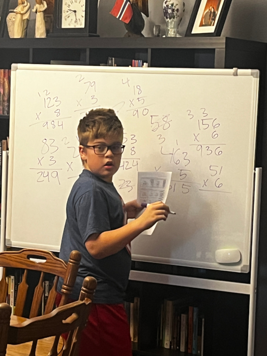 And we had school, of course. For math I am practicing multiplying. I wanted to do it alone, but Mom took a couple pictures while I was concentrating and working hard.