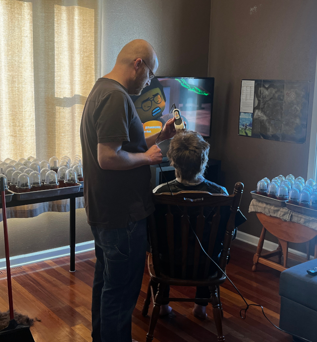 It's getting warm so it was time for a haircut on Friday. I chose to have Dad do it rather than go to a barber (you can see all of Mom's plants in their mini-greenhouses on the left and right). We were supposed to go to Homeschool Gym, but it was cancelled because there was a gymnastics tournament. So Dad and I ran some errands and went to the comic book store instead.