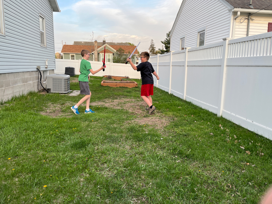 On Star Wars Day - May the Fourth Be With You! - Mom and I skipped school and watched Revenge of the Sith (since we had just finished Clone Wars). And then in the evening we had Jonathan and his parents over. We ate a lot of cookies, played with LEGO, and had a lightsaber battle outside, which is much more appropriate than in the living room.