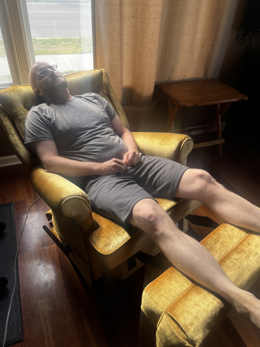 Mom and Dad were at home for the weekend. Mom made those cookies, and she worked on plans for our big trip in the fall. Dad played video games and mowed the lawn. He also set up the chair that used to belong to Great-grandpa Les and Great-grandma Muriel. I guess that was a lot of work so he had to take a little rest.