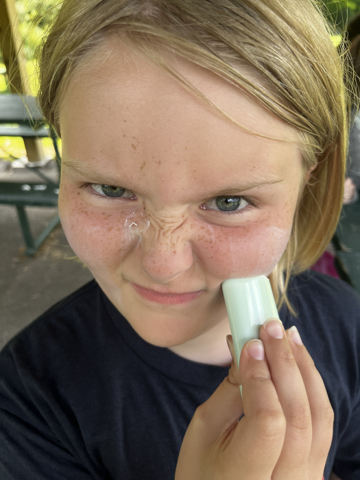 Freya getting on sunscreen for Recess at the creek.