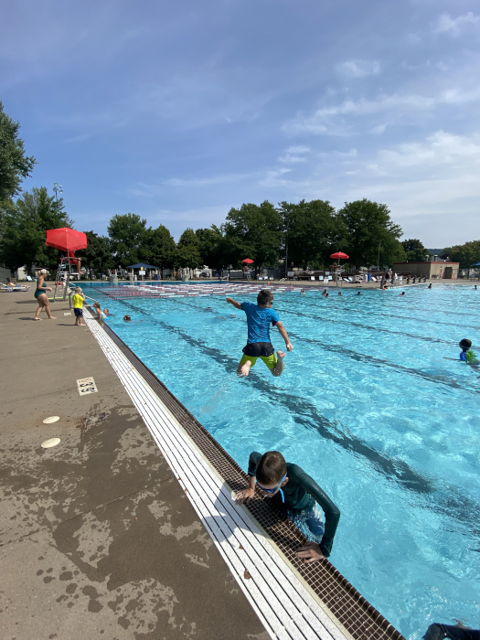 For Day 1, Mom and I met Kara and Freya at GG and Grandpa Kevin's, and Freya came home with us. We went to my swim lesson, had lunch, then went back to the pool for an extra Recess day. And then we watched movies: Pee-Wee's Big Adventure and Big-Top Pee-Wee. Mom made Mac and Cheese for supper.