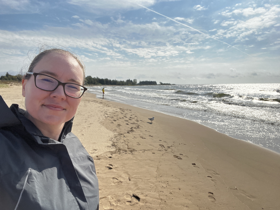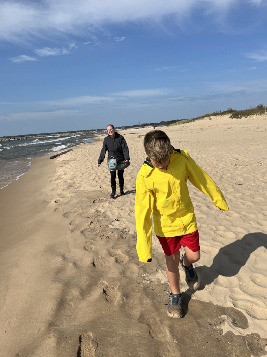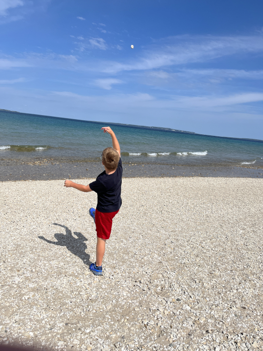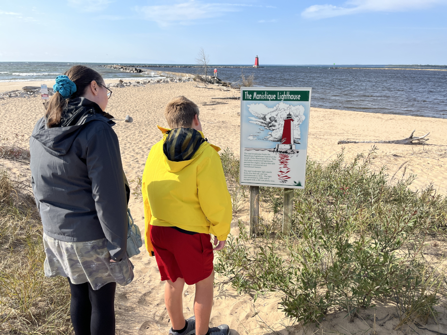 Our first stop was the Manistique Lighthouse. It was really windy. Mom and I stayed on the beach, but Dad walked out to see the lighthouse, dodging waves that crashed over the walkway.