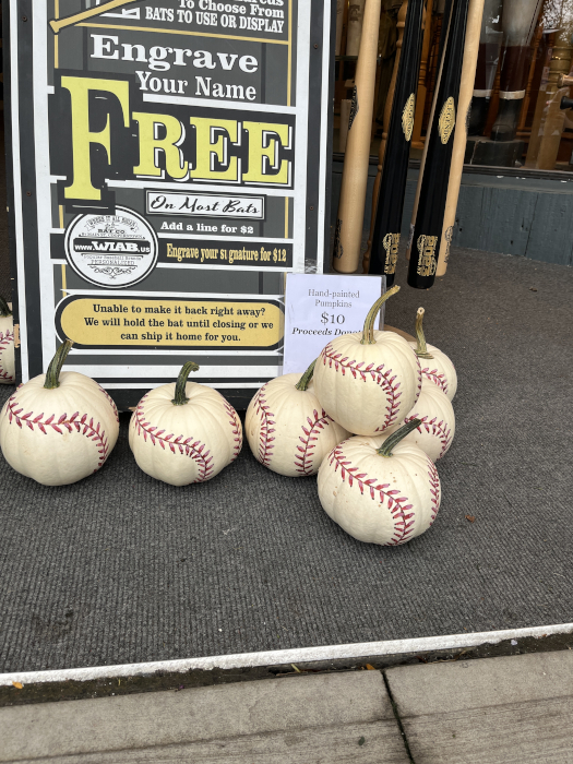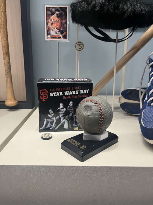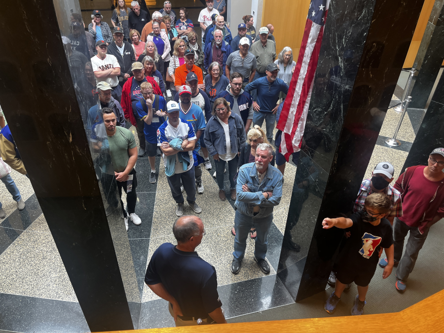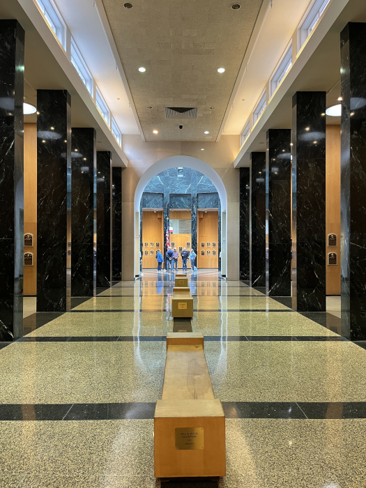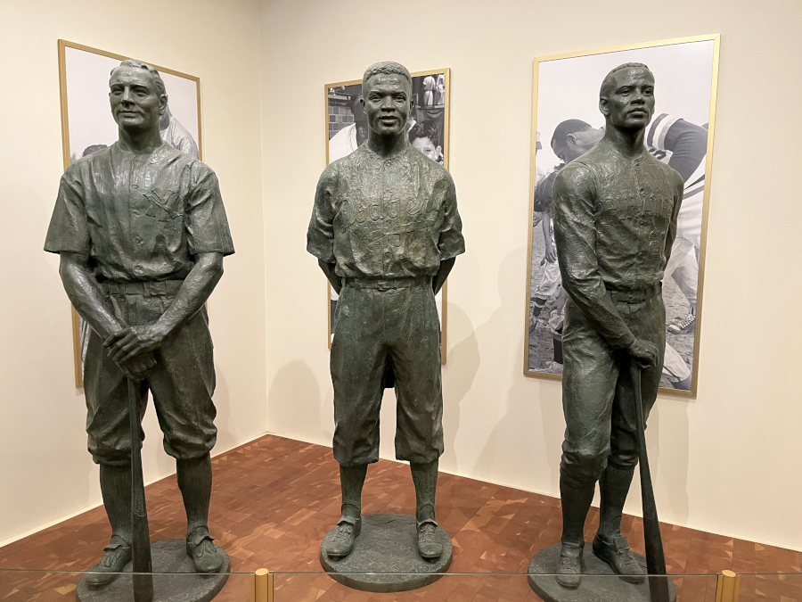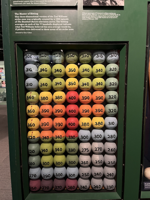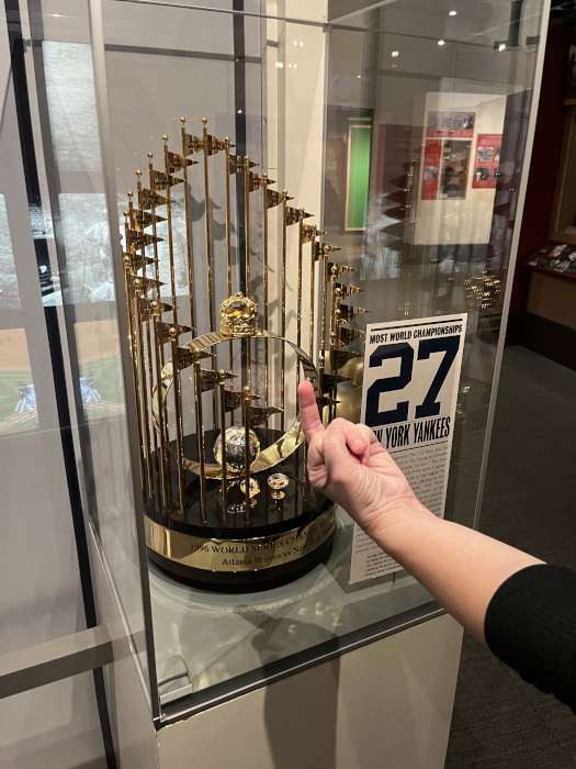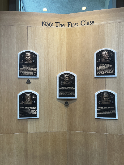 That was a taste of the museum. Then we went down to the Hall of Fame for a talk on how the selection process works, how the Hall has changed over the years, and some stories about the players. Before the talk started, the guide gave an extra little talk about the evolution of baseball bats - and we got to hold a replica Babe Ruth bat and actual bats used by Aaron Judge and Mookie Betts!