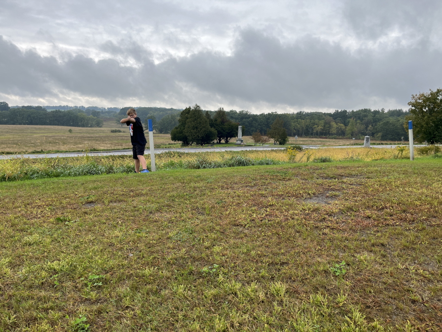 The American lines are marked with blue-topped posts, the British with red-topped posts. I am pretending to hold the line.