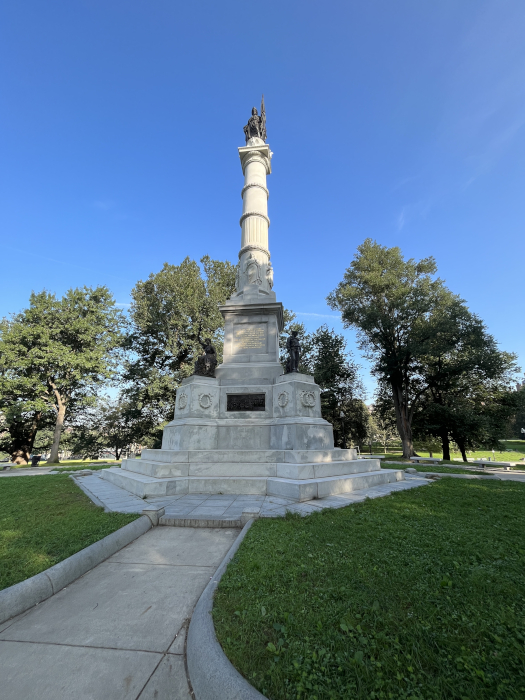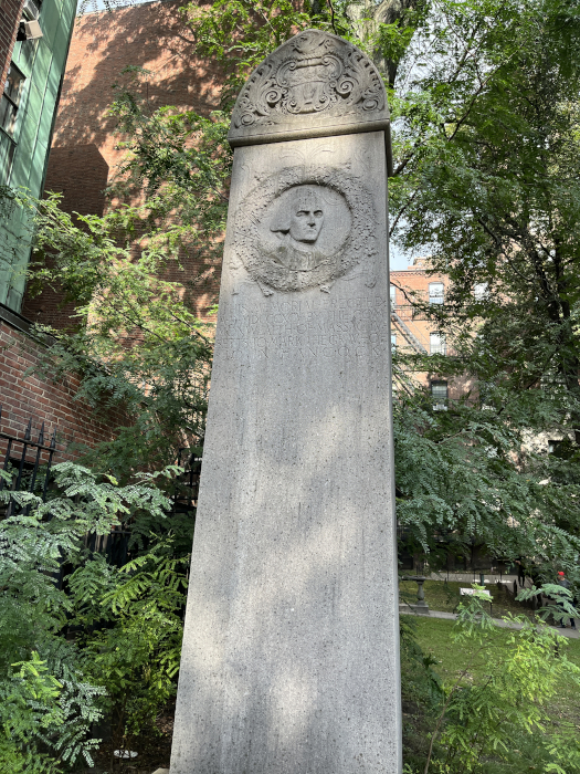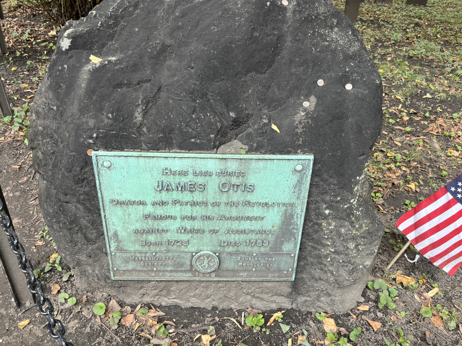 The marker for James Otis. He was the one who came up with the phrase "no taxation without representation." He's not as well-remembered as other founders because he was hit in the head by a redcoat during a protest in 1769 and suffered brain damage. He never really recovered, and ultimately died by being struck by lightning.