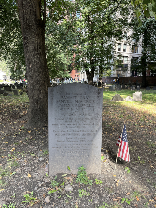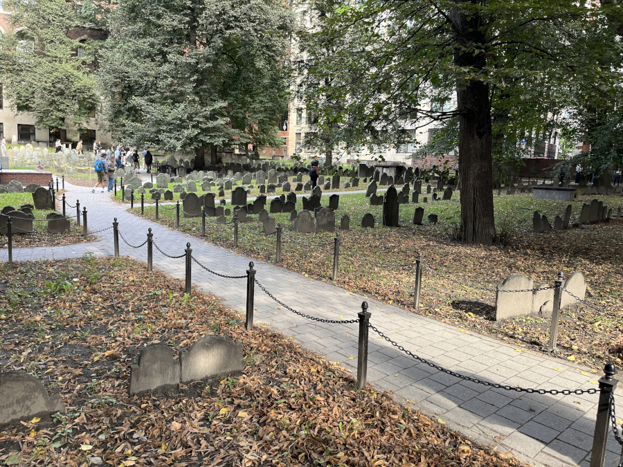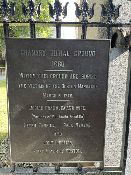 The Granary Burial Ground. Three signers of the Declaration of Independence are buried here, as well as the victims of the Boston Massacre.