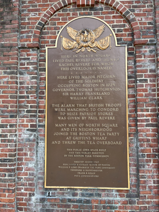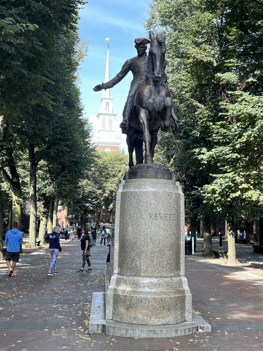 Paul Revere's statue commemorating the Midnight Ride, with the Old North Church in the background.