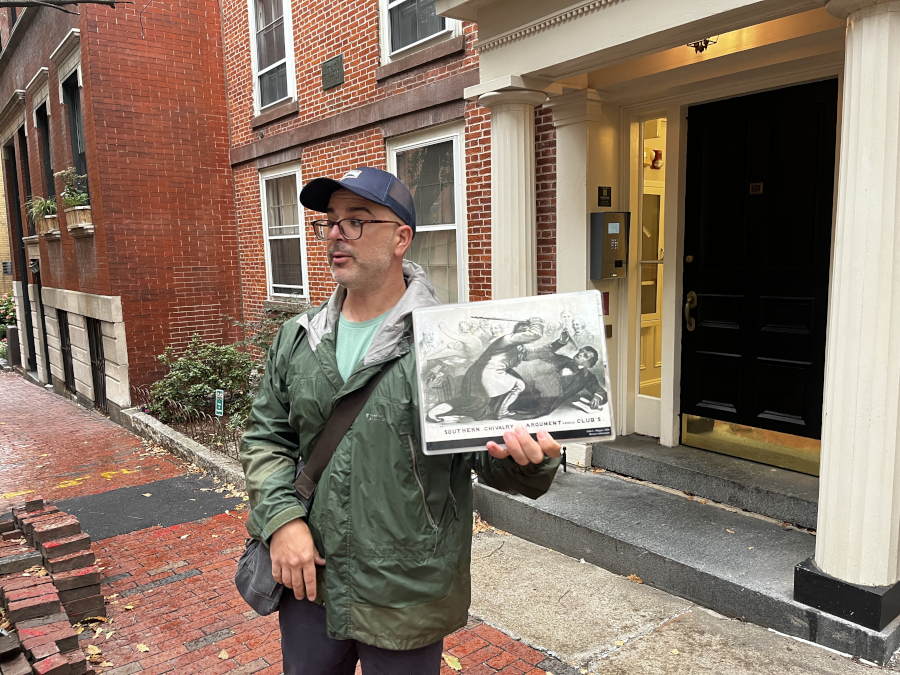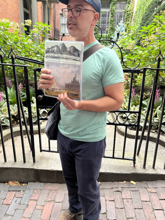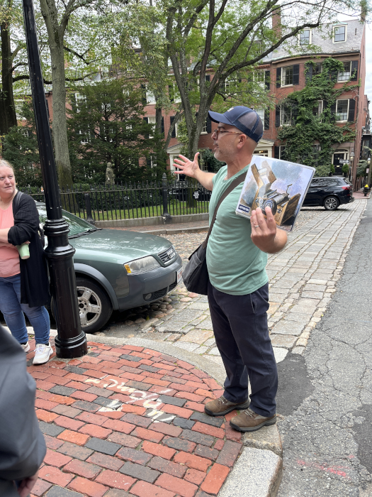 Dave explained how the money in the neighborhood was originally made from shipping, but later the wealth was from making cotton textiles. The wealthy Bostonians who were against slavery actually helped perpetuate it by providing a profitable market for slave-grown cotton processed by the cotton gin and the water loom, both of which made New England rich.