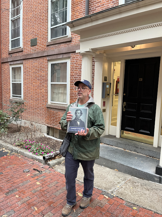 At the Sumner House. Charles Sumner was an abolitionist who was nearly beaten to death in the Senate Chamber while half of his colleagues cheered the beating! And you think politics are bad now.... He spent four years recovering from his split skull - but he never stopped fighting to end slavery.