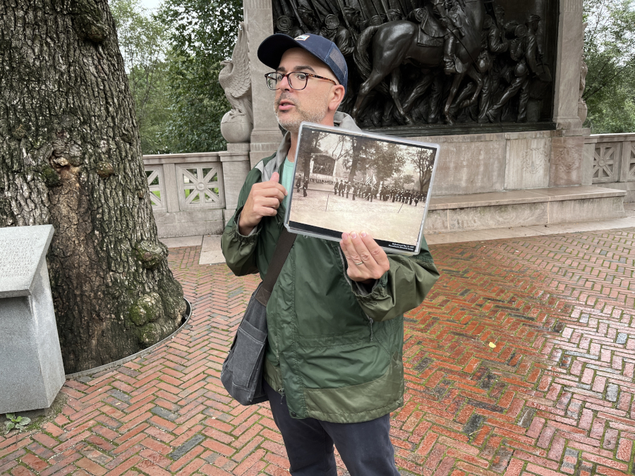 Dave is holding a picture of the remaining members of the 54th at the dedication of the monument in 1884. The first black man to win the Congressional Medal of Honor was in the 54th - Sgt. William Carney, who carried the flag in the charge on Fort Wagner after the first color bearers were killed. He planted the flag on the fort, despite being shot several times, and held it there until he was rescued.