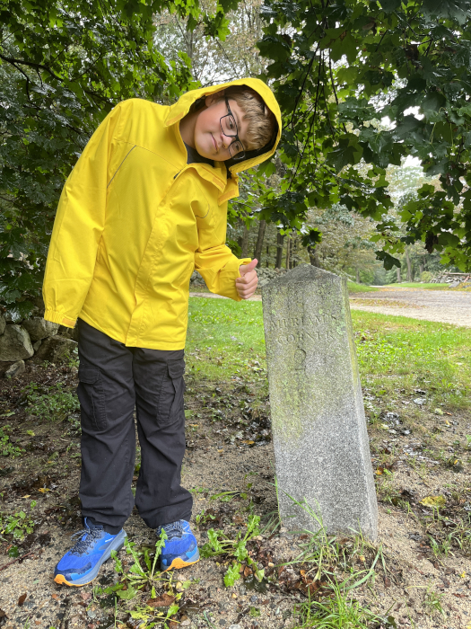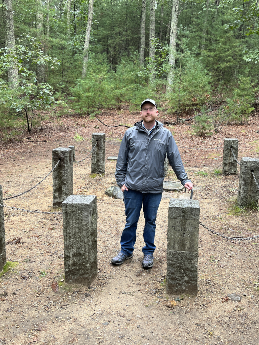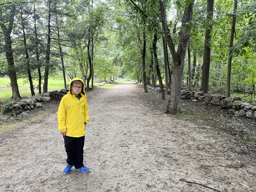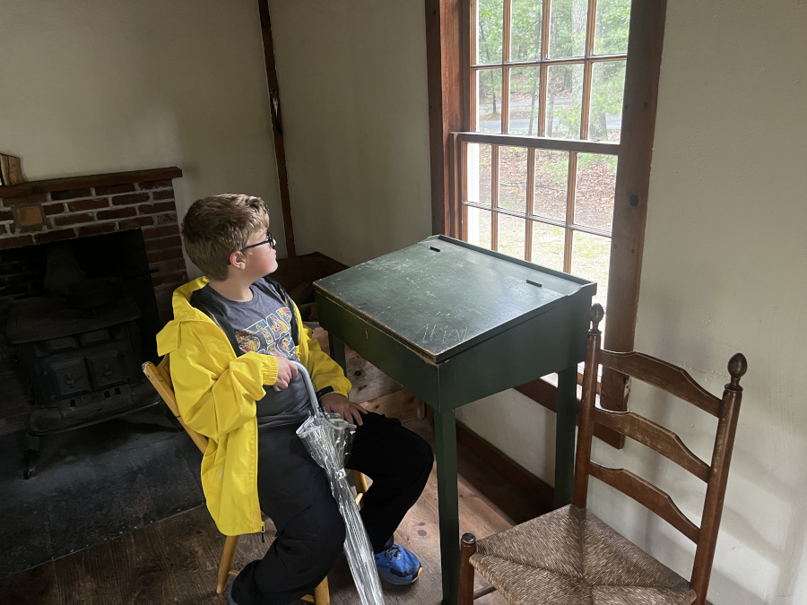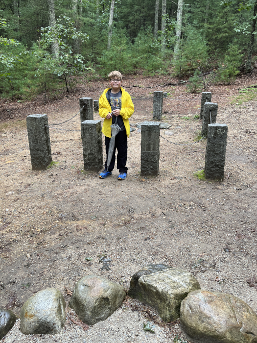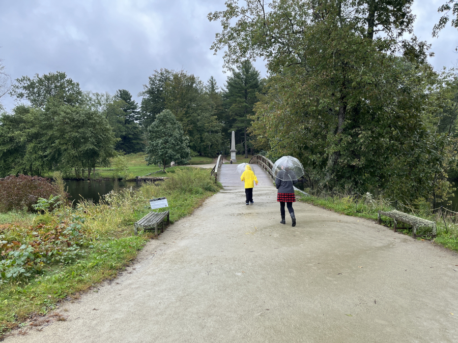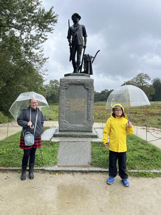 Today we went to the Minuteman National Historic Park to see the Battle Road and the Old North Bridge. We kinda went backwards because we were too excited to get started. And after that we went to Concord to see Walden Pond. It was rainy and cold, and some things were closed beacuse it's Monday, and some things were closed for repairs - but we hopped in and out of the car to see what we could.