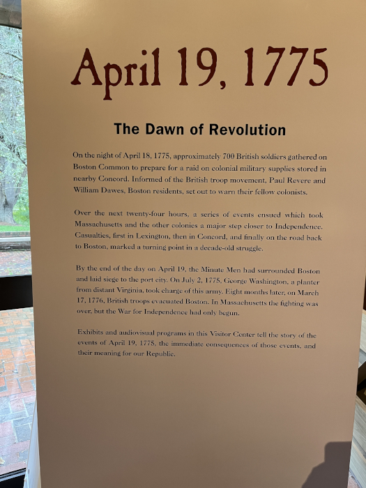 At the Minuteman visitor center we watched a great short film that used multiple screens to tell the story of April 19th, 1775, and what happened in the immediate aftermath as the colonies mobilized for an ongoing conflict with the British Army. They also had some really excellent displays and artifacts from the era.