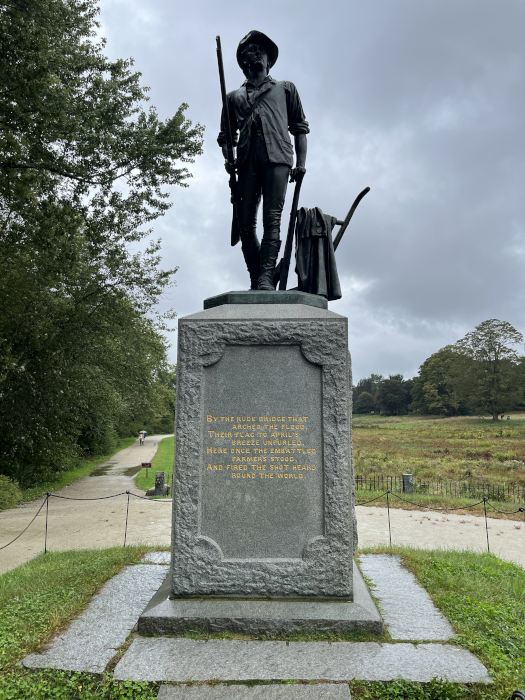 The Minuteman statue just before the bridge. Four hundred colonial militiamen gathered here to await the arrival of the 700 British regulars sent to destroy the guns and ammunition stored at Barret's Farm. Without those arms, there would be almost no way the colonists could fight back against the British.