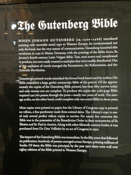 A Gutenberg Bible. The Library's copy is in three volumes, and they rotate them through the display every six months, and change the pages displayed every month so the pages don't get light damage.