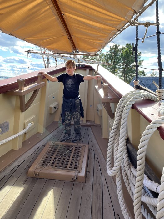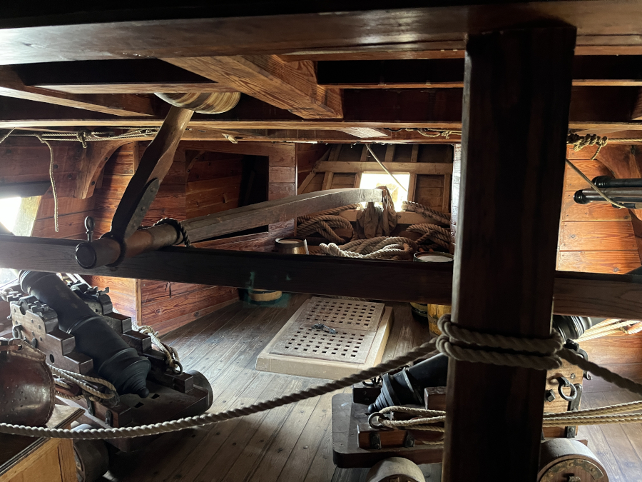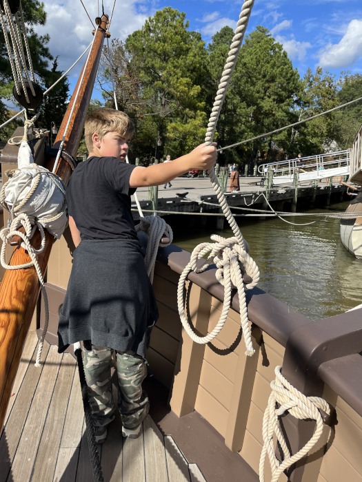 In front of the Susan Constant, the ship our ancestor, Captain Christopher Newport, sailed. This is one of the ships that brought the colonists over.