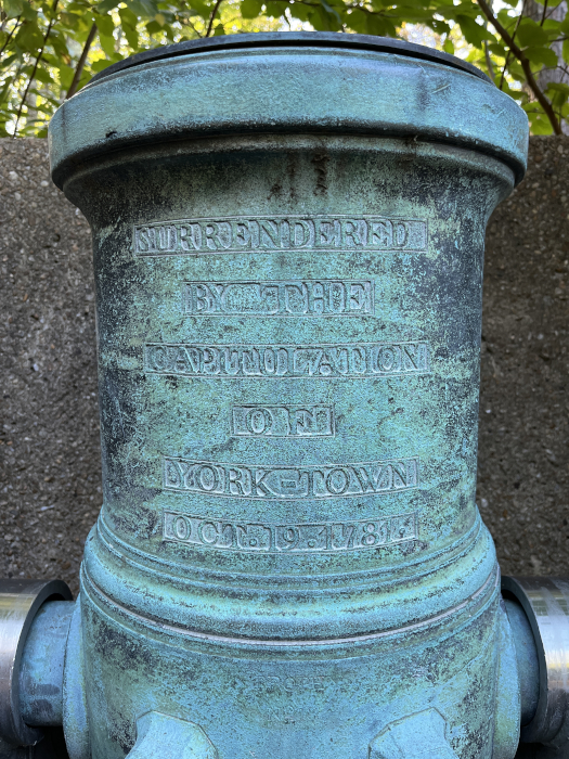 A captured mortar. There were quite a few captured artillery pieces, and they all had a variation of this script on the outside. "Surrendered by the capitulation of York-Town, Oct. 19 1781.