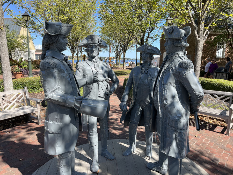 Some fun sculptures in the little cluster of shops. From left to right: General Washington, General Lafayette, General Rochambeau, and Admiral de Grasse - the big played for the Americans and French at Yorktown.