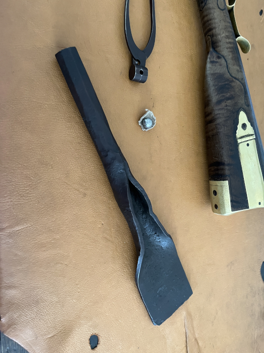The big piece of metal shows how the make the barrel, by hammering a flat plate of steel into a long cylinder.