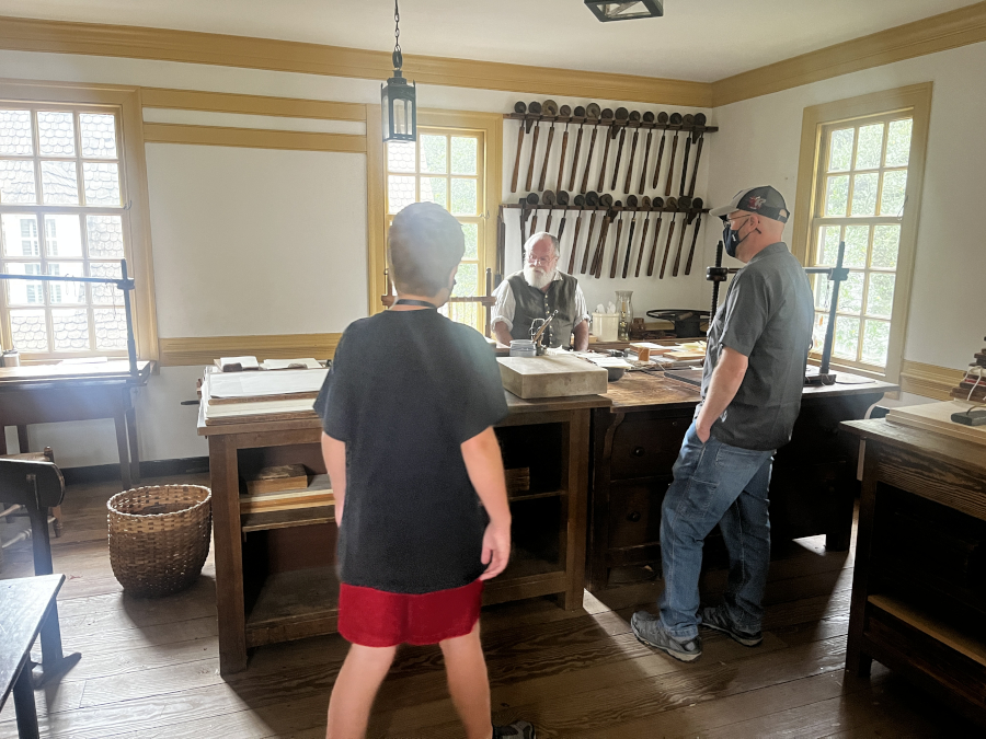 Downstairs was the printer. He was working on printing the paper. Other than the paper, the printer would publish broadsides and the occasional pamphlt, but most work in Williamsburg was for the government, since the Capitol and the House of Burgesses were right down the street.