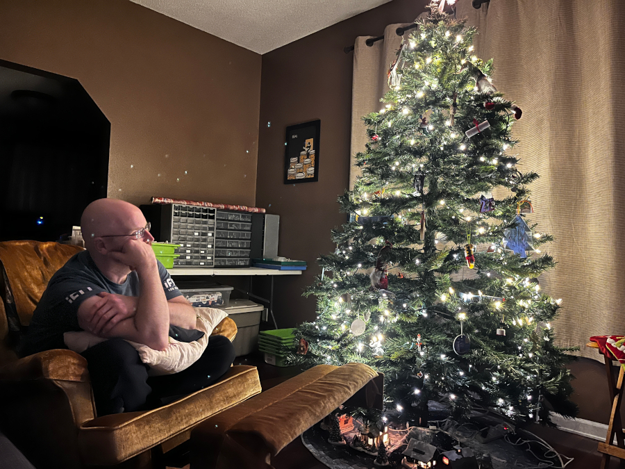 Dad, by the tree, watching The Dirty Dozen.