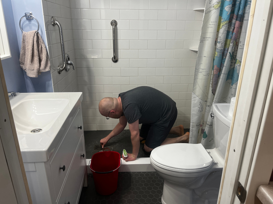 Dad doing some cleaning. He mopped all the floors and scrubbed the shower.
