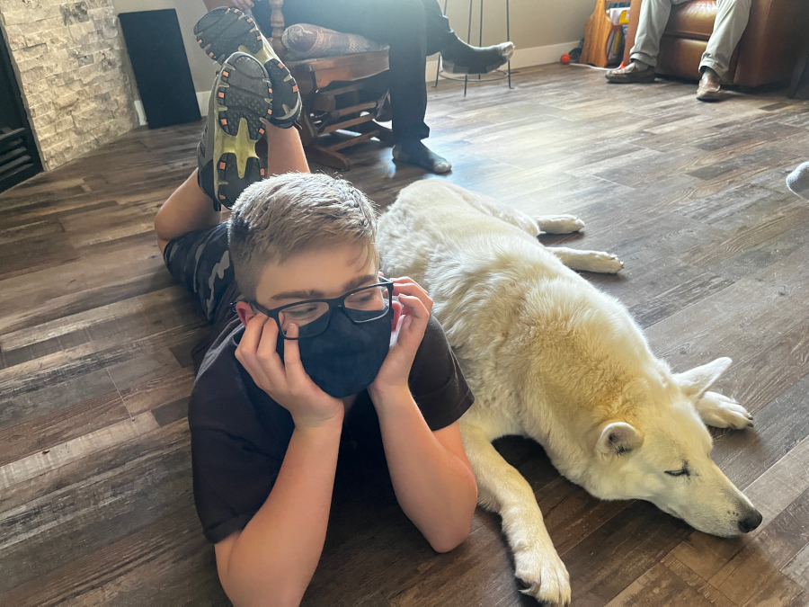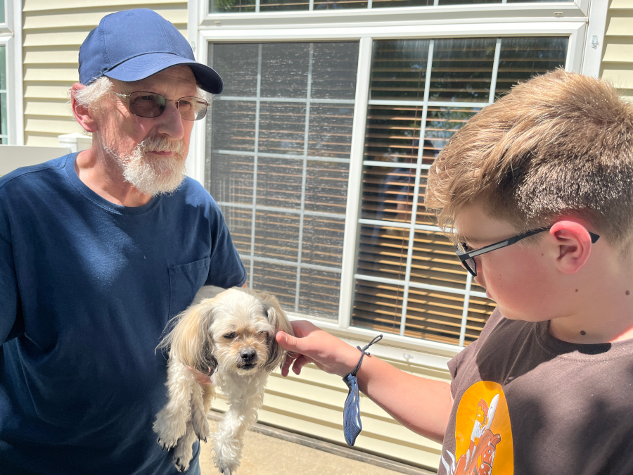 After lunch on Sunday we went to deliver some flowers to Moms/Grandmas. Unfortunately, GG was not home and we woke up Grandpa Kevin from a nap. And then we forgot to get a picture of Grandma Wynne with her flowers (they were white orchids). But we did get pictures with Abby and Loki. And Mom got an orchid, too - hers is yellow and purple.