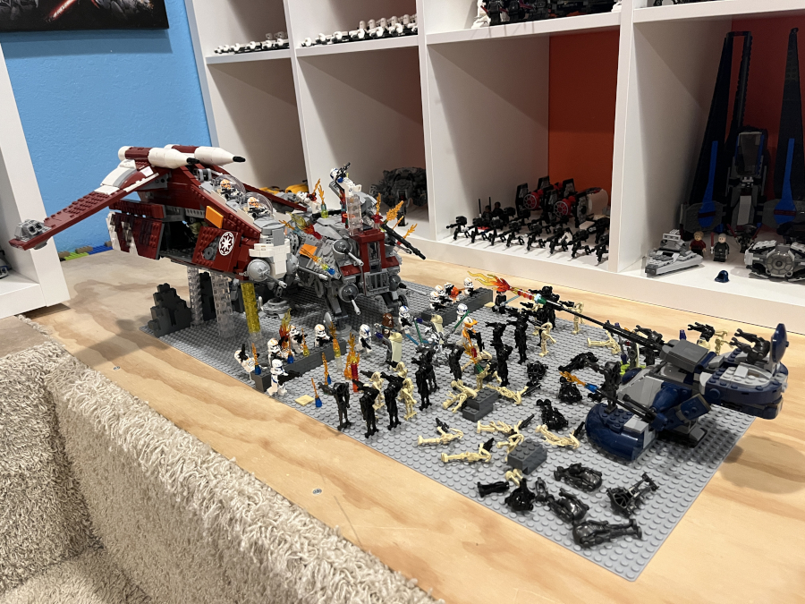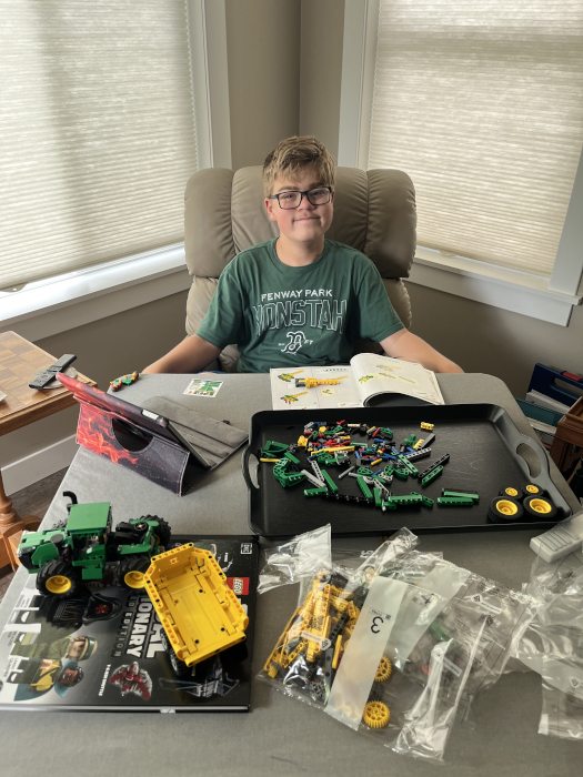Working on my new John Deere frorage harvester LEGO set. My new Star Wars LEGO book is under the John Deere tractor.