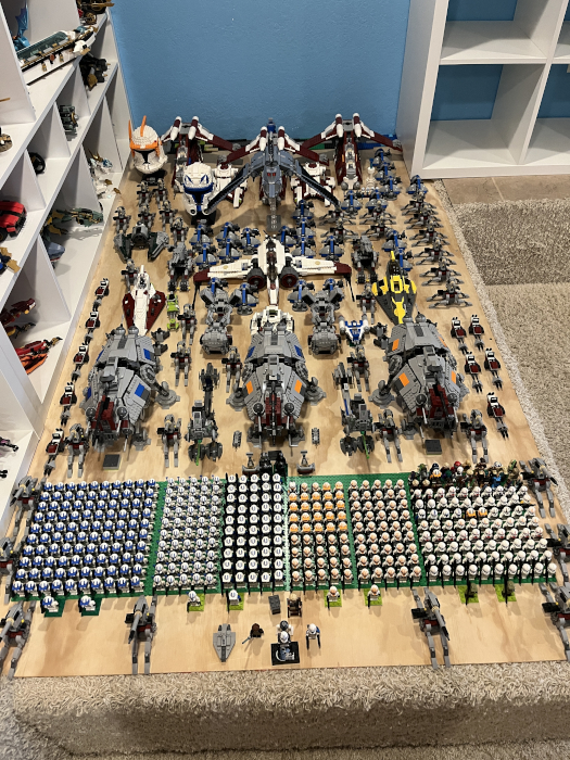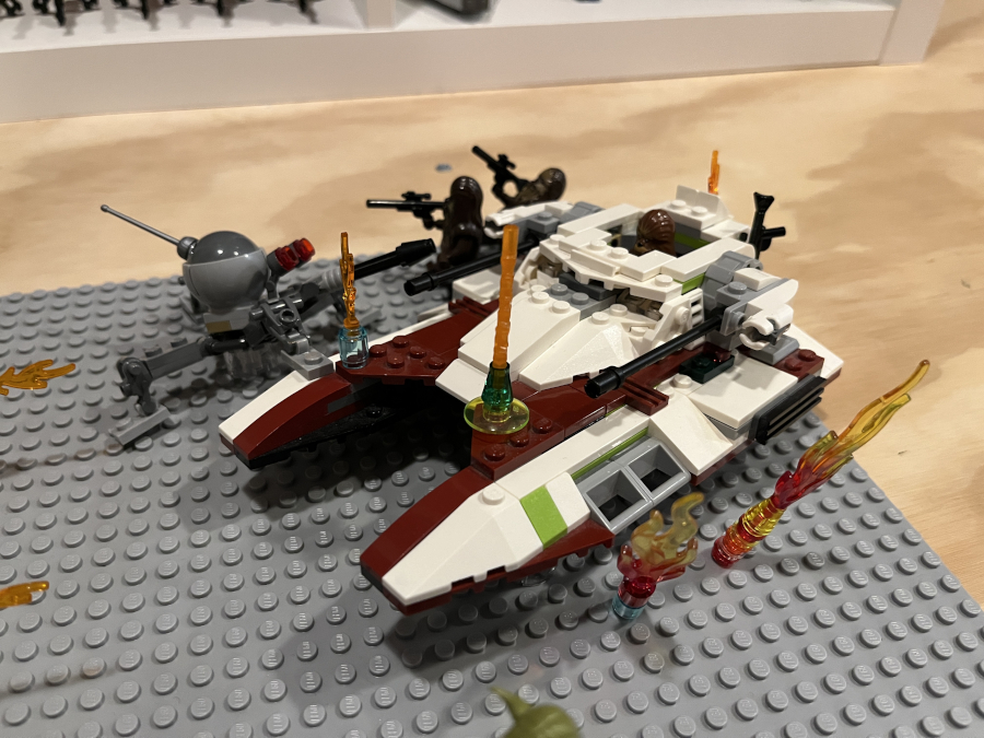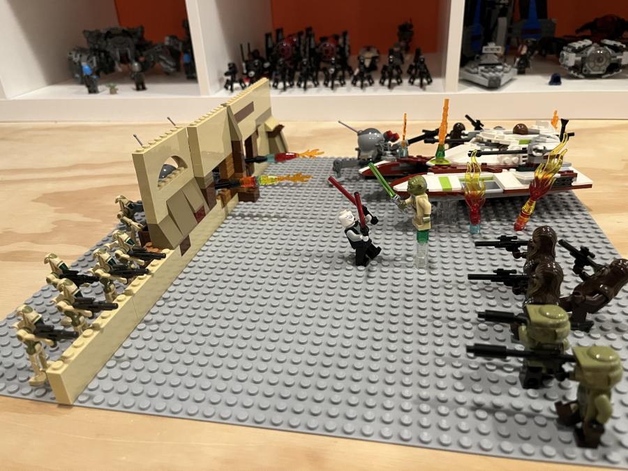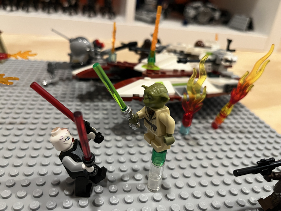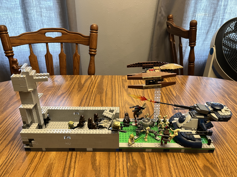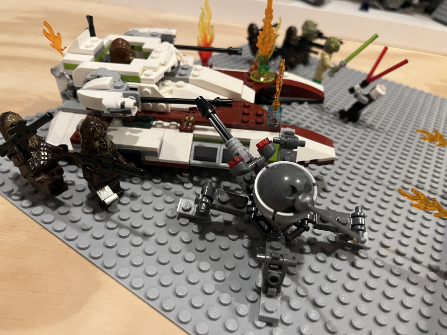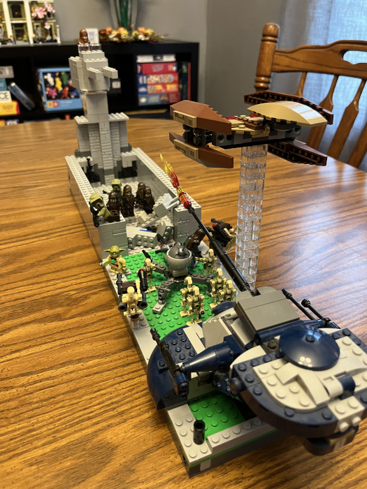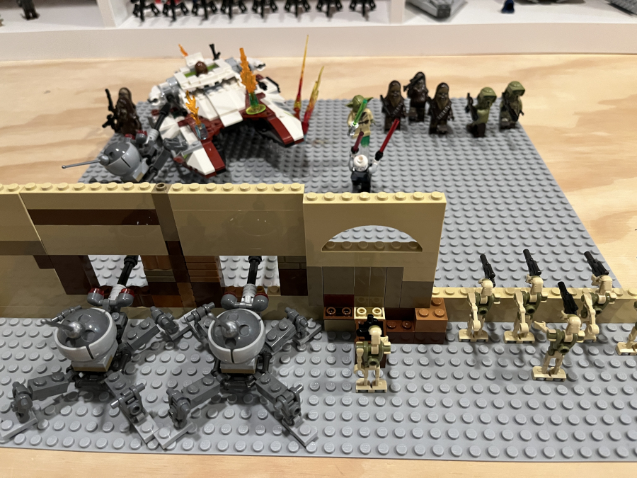 And I built another Kashyyyk battle, this one on a modular platform I was experimenting with. This one has Separatists attacking a Wookie base, with Yoda there to help the defense.