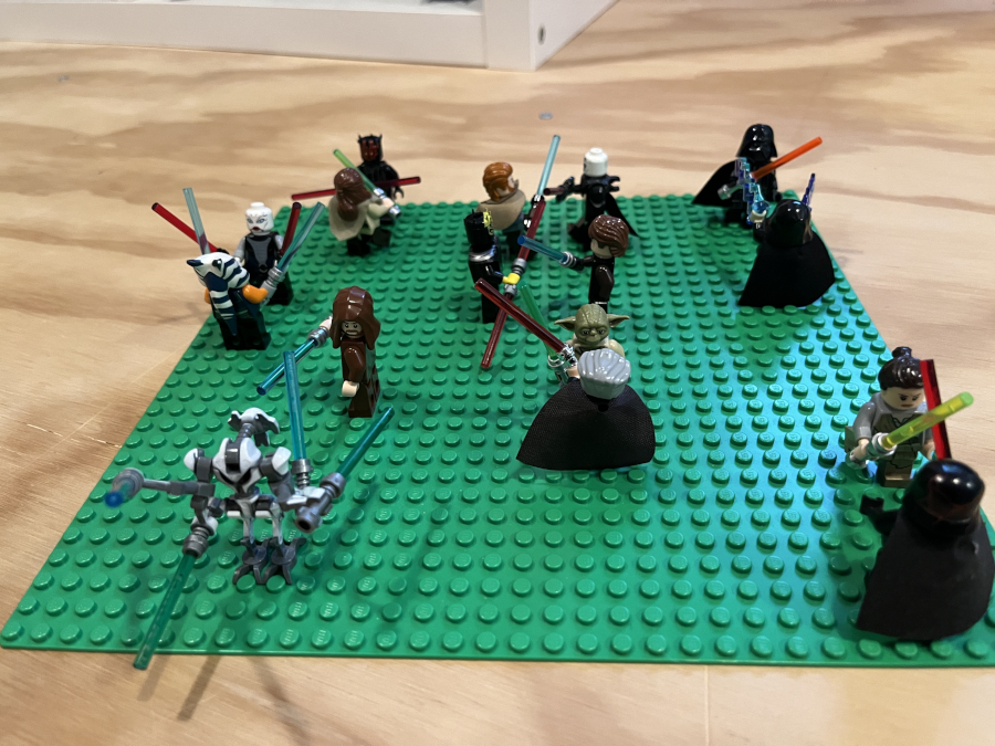 And last, I put together some of my favorite duels from Star Wars all on one base plate. I have Ahsoka vs. Ventress, Qui-Gon vs. Darth Maul, Obi-Wan vs. The Grand Inquisitor, Darth Vader vs. Emperor Palpatine, Anakin vs. Sauvage Opress, Yoda vs. Count Dooku, Rey vs. Kylo Ren, and Obi-Wan vs. General Grievous.