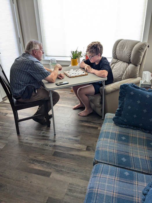 Playing checkers with Grandpa Al. It's a LEGO checkerboard - the one I got him for his birthday.