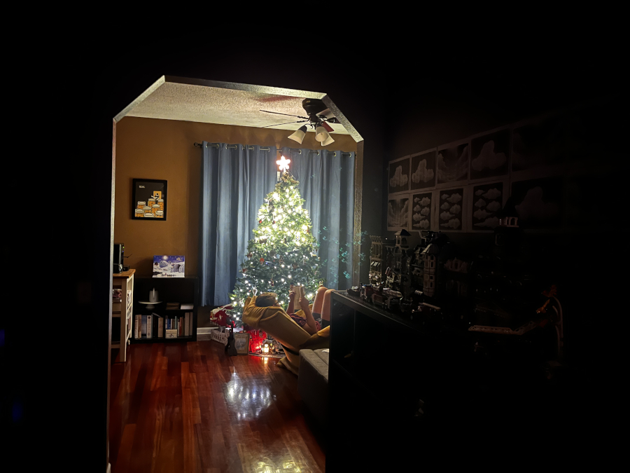 Reading by the light of the Christmas tree.