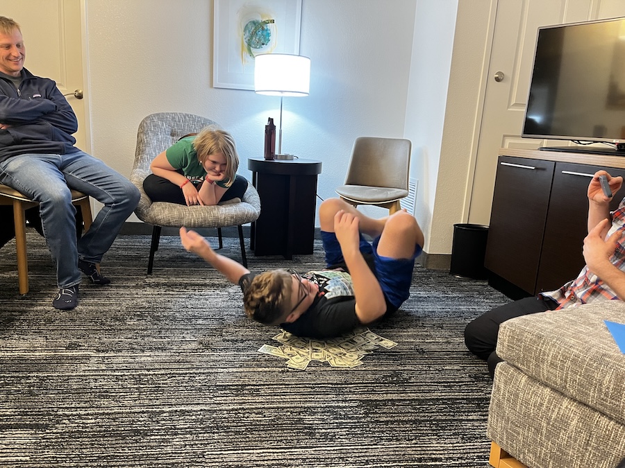 Back at the hotel, GG and Grandpa Kevin were there, and later Josh, Kara, and Freya came over. We had Little Caesar's pizza at my request, and Kara made a chocolate cake which was delicious!