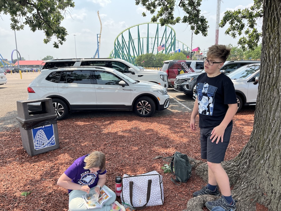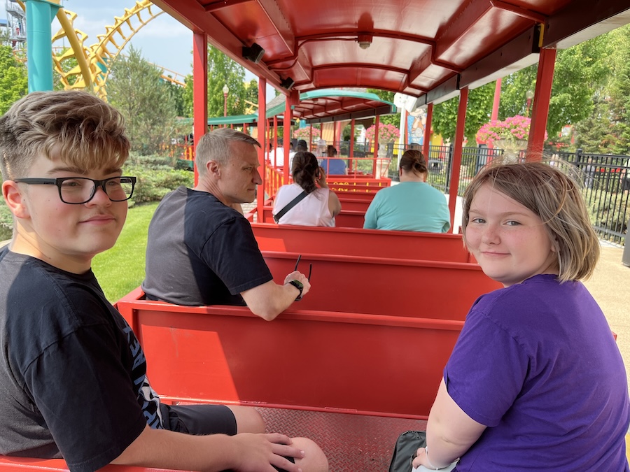 Most of this week was pretty normal - finishing up school with Mom and Dad, going for bike rides, and playing with LEGO. We had recess one day, with Jonathan at the creek. And I had an orthodontist appointment - probably going to get my braces off by the end of the year! We also delivered some rhubarb treats to GG and Grandpa Kevin. But the big excitement was on Sunday: we went to the amusement park with Freya and Josh. Mom came along, but she went to see Great-grandma Muriel while we were going on rides.