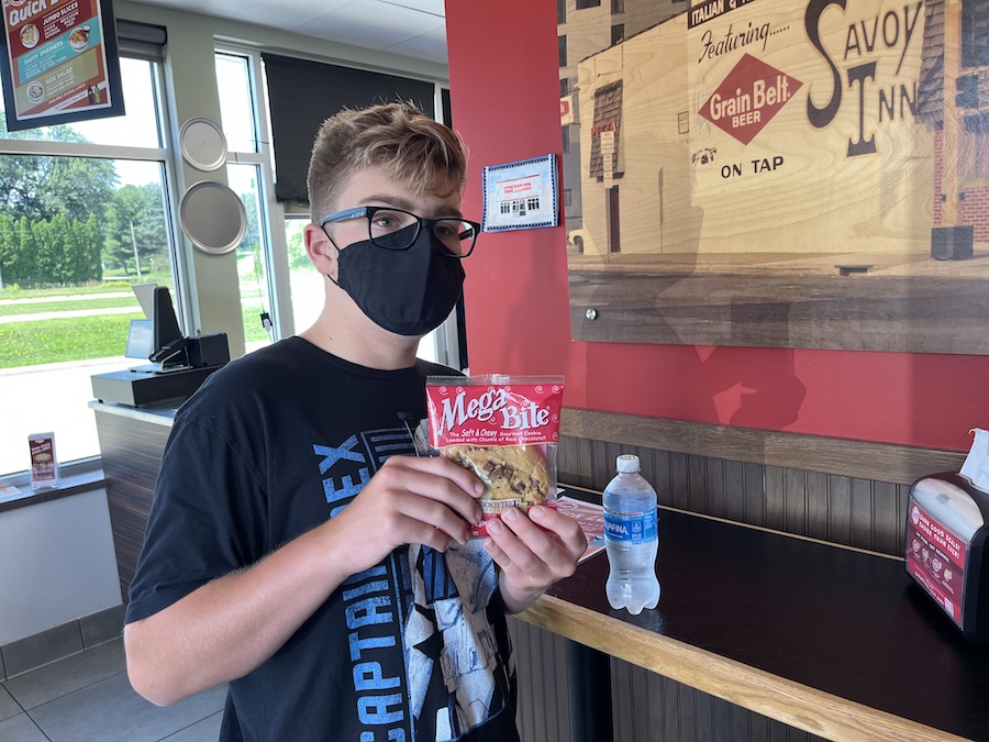 Taking a lunch break for some pizza and a cookie.
