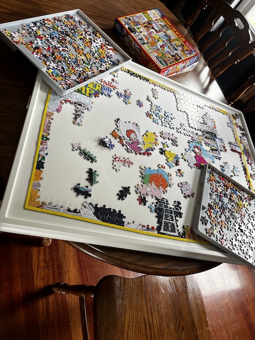 Mom got a new toy this week: a puzzle table. It spins and has trays for pieces - this way it is easy to pick the puzzle up and move it.