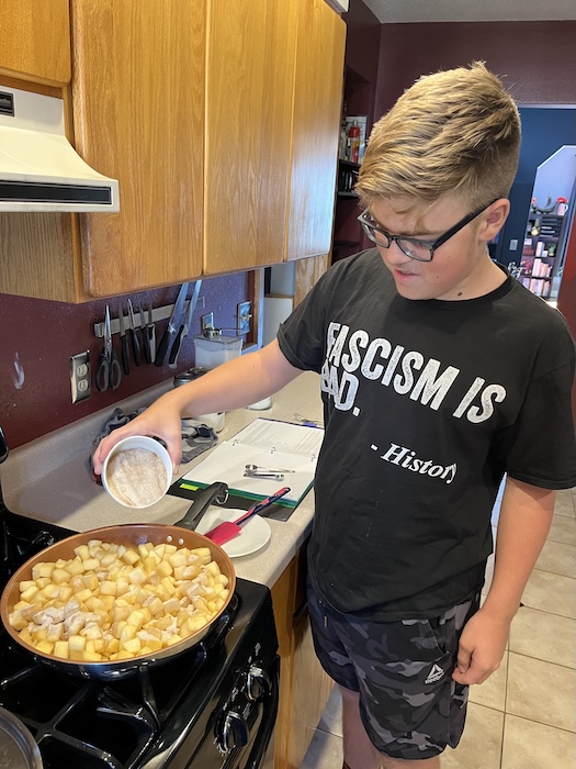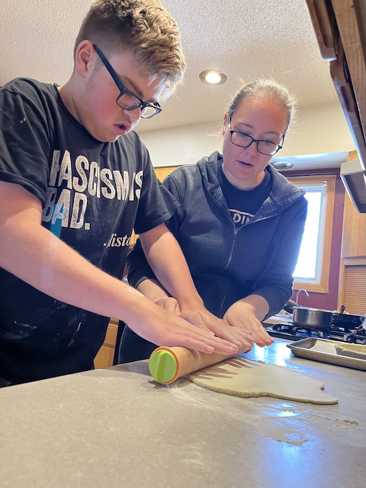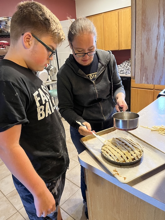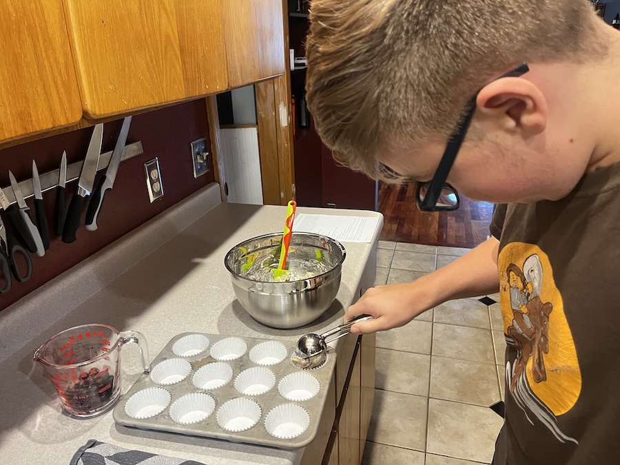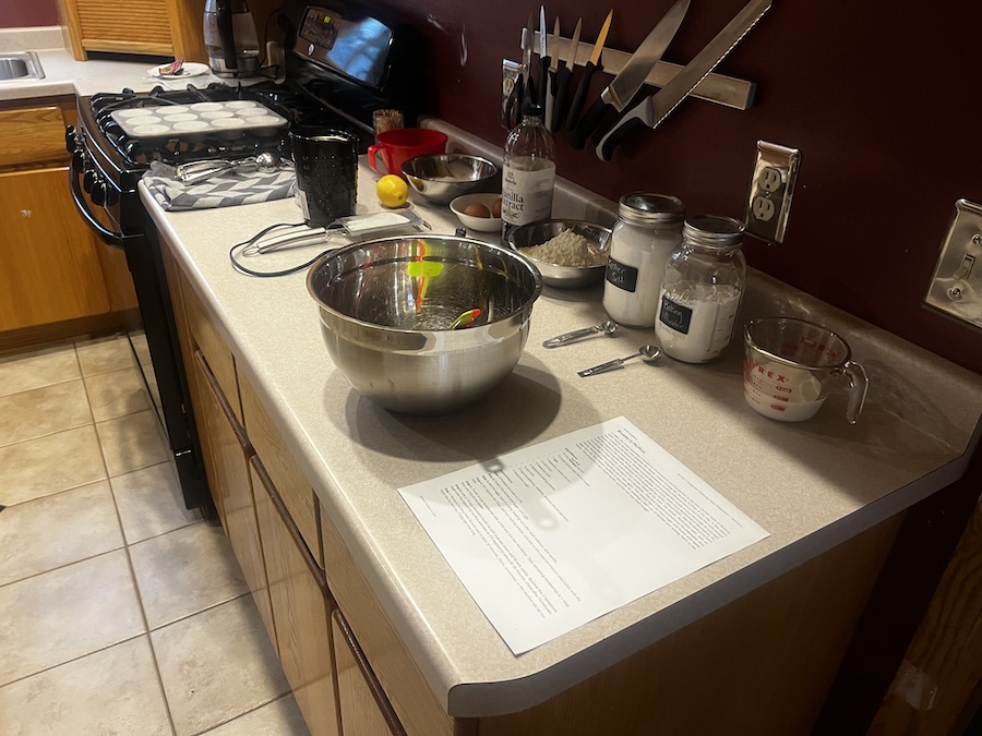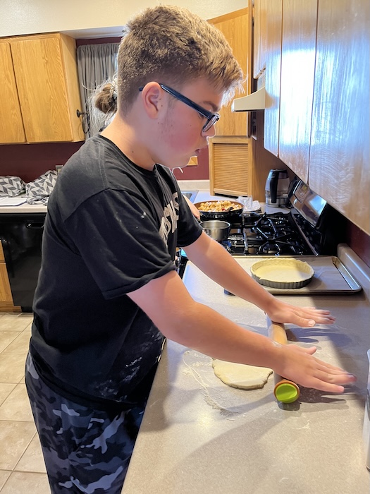 Sunday we finished getting ready for Bob's visit by making some tasty things to eat. Mom and I made apple pie and more blueberry muffins. And Dad wanted some chocolate chip cookies, so Mom made those, too. And she also made mashed potatoes and fresh from scratch biscuits, hamburger gravy for Bob, and the mushy peas. It was a lot. Mom is amazing.