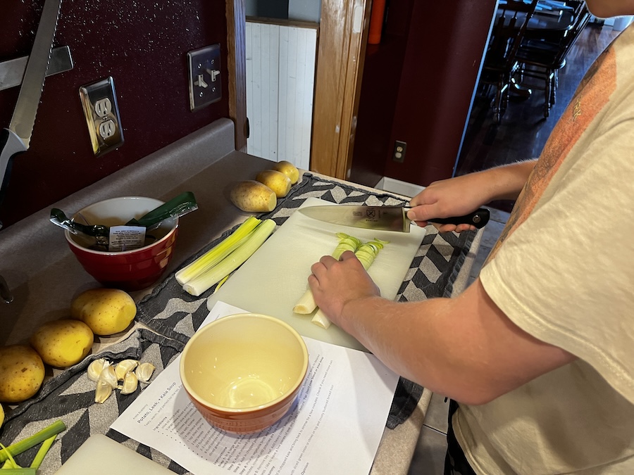 Chopping the leeks.