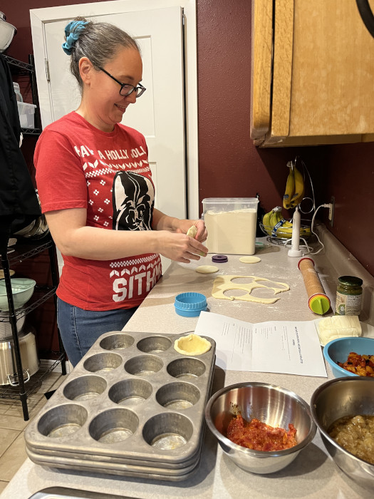 Mom making savory tartlets.