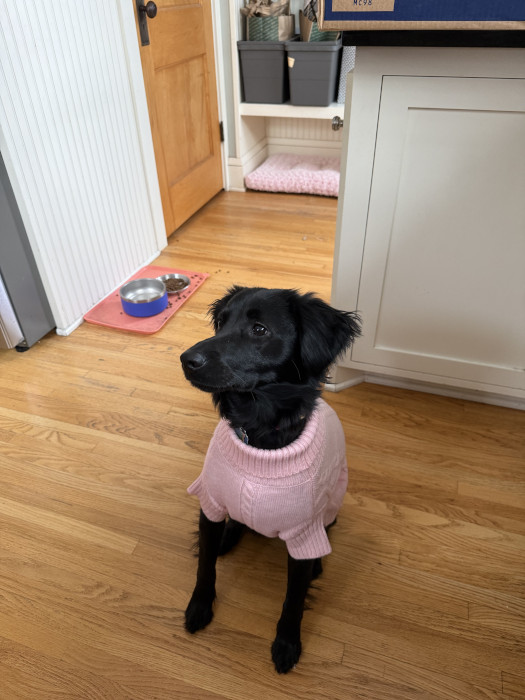 Zelda wearing the sweater we got her.
