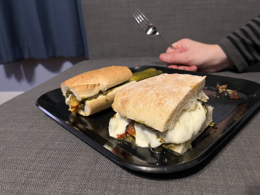 Roasted potatoes and roasted tomatoes with pesto and fresh mozarella - and homemade buns.