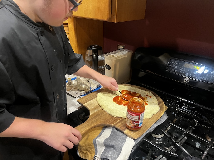 Adding sauce.