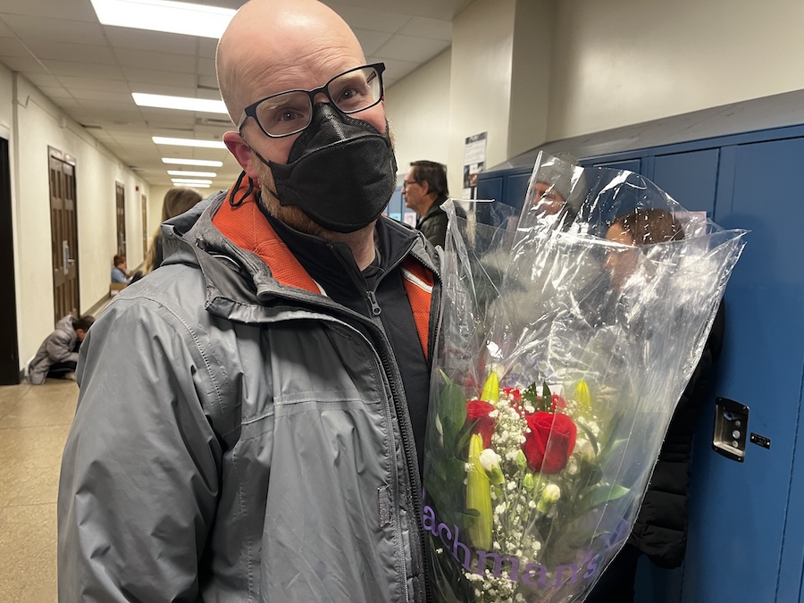 Dad holding flowers for Freya for after the performance.